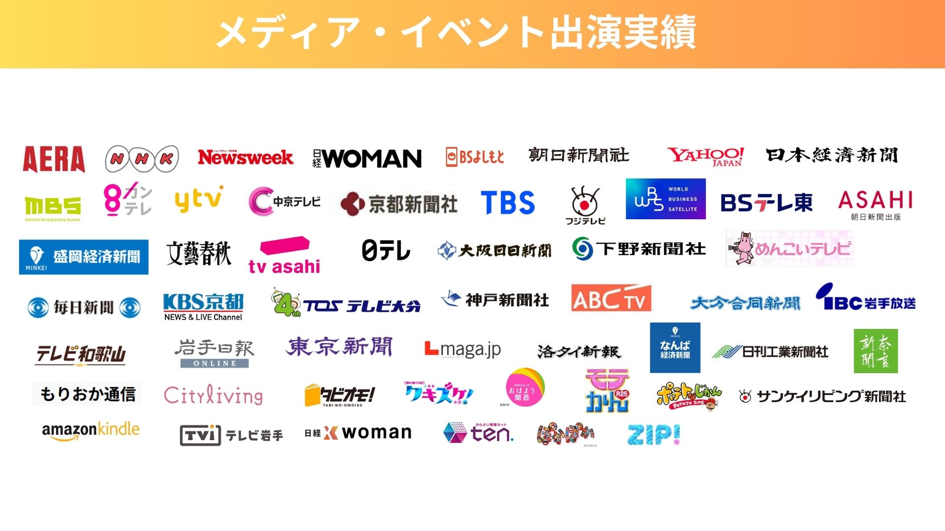 NHK/日本テレビ/TBS/朝日新聞社/日本経済新聞社 /日経WOMAN/WBSラジオ/読売新聞/株式会社CCCメディアハウス/中京テレビ/毎日新聞/CRT栃木放送/大分合同新聞/出版社 ほか